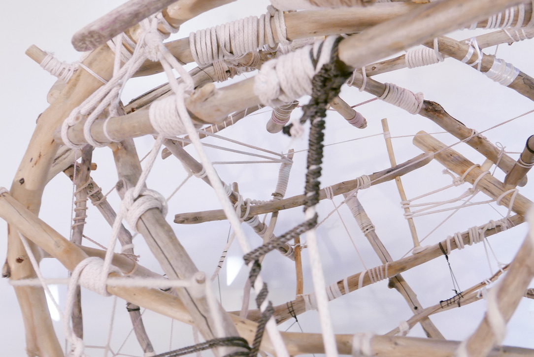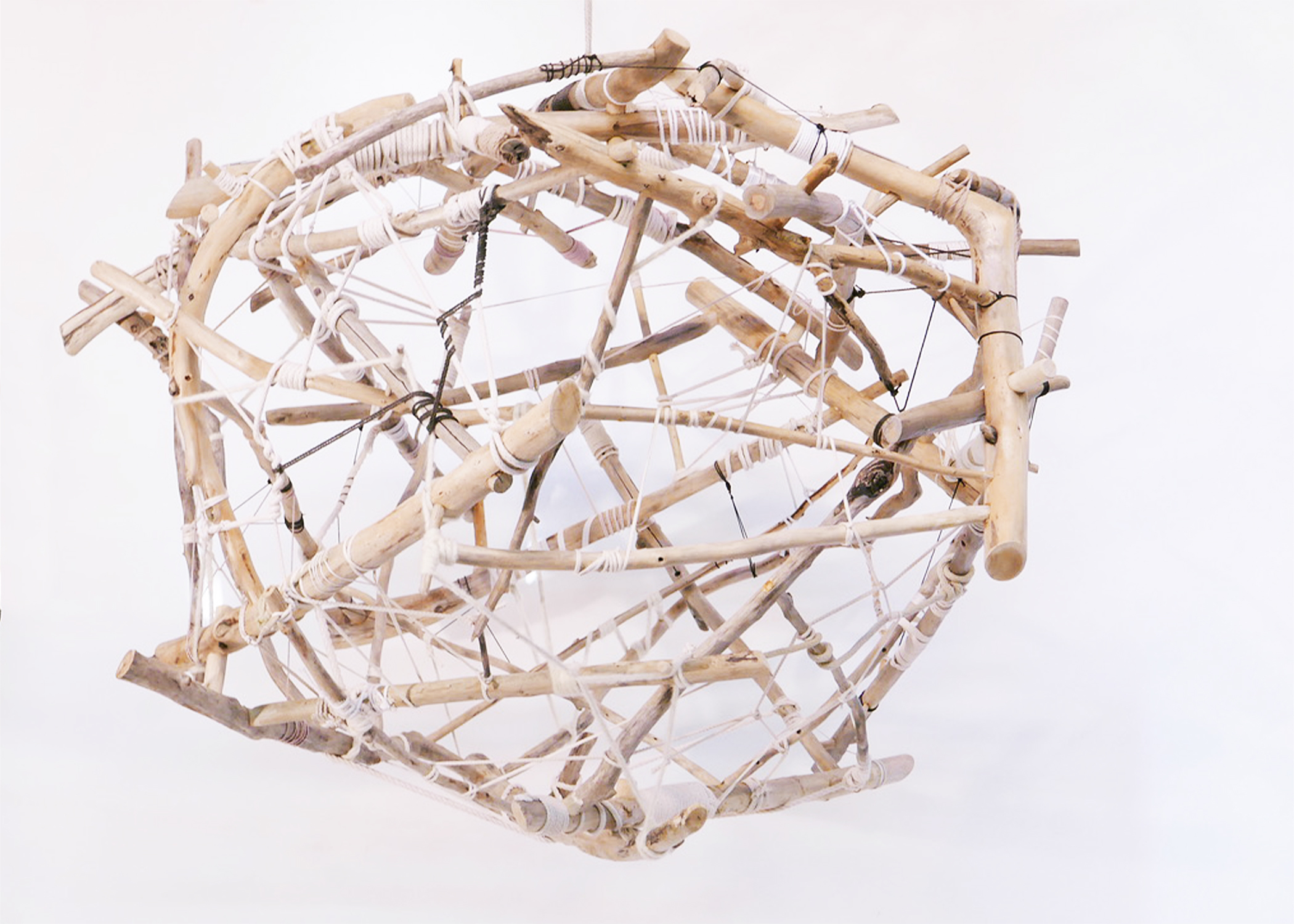 Large format Scatter Gather with client customized rope and cord. Fitted with glass globes and bulbs. Found Driftwood