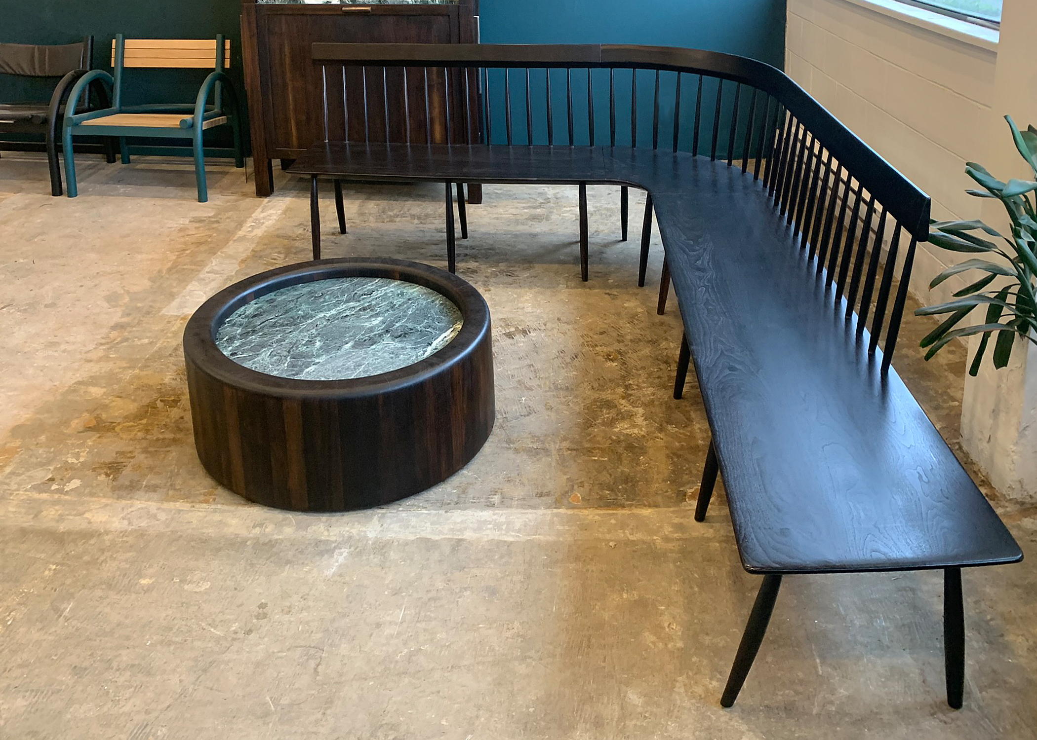 Solid Oxidized Walnut wrap around setee with hand turned backrest spindles and legs. Every detail from the backrest to the sculpted seat designed custom for the client.