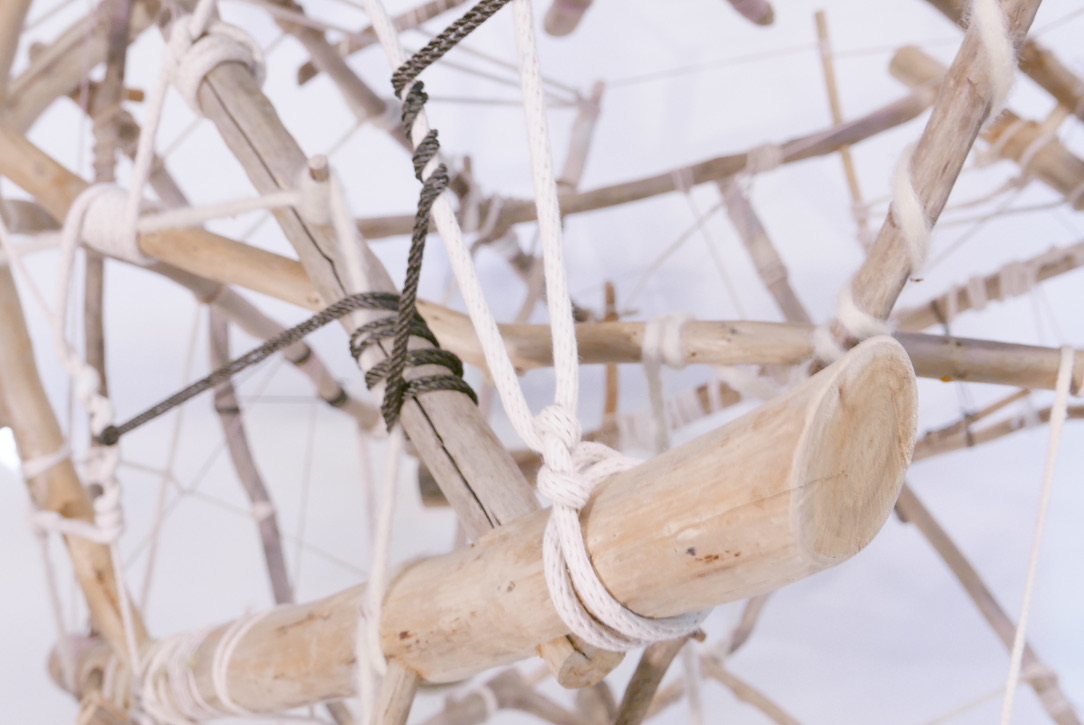 Large format Scatter Gather with client customized rope and cord. Fitted with glass globes and bulbs. Found Driftwood